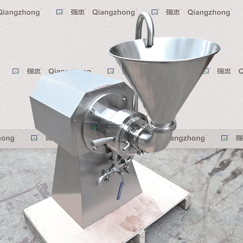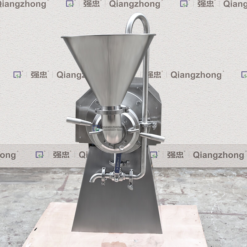 胶体磨的基本原理是流体或半流体物料通过高速相对连动的定齿与动齿之间,使物料受到强大的剪切力,磨擦力及高频振动等作用。磨碎依靠磨盘齿形斜面的相对运动而成,其中一个高速旋转,另一个静止使物料通过齿斜面之间的物料受到极大的剪切力和摩擦力,同时又在高频震动和高速漩涡等复杂力的作用下使有效地被粉碎、乳化、均质、温合,从而获得满意的精细加工的产品。